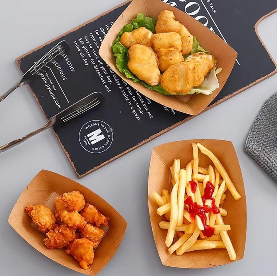 Kraft paper finger food containers are a perfect alternative to single-use plastic products. These cardboard boats are suitable for serving small meals, burgers and other finger food dishes.