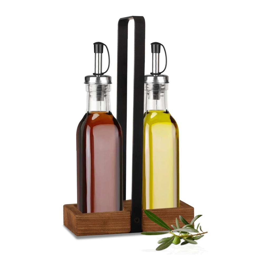 The wooden oil and vinegar seasoning set, with black metal accessories, will be an indispensable addition to any table - both because of its elegant appearance and its affordable price.