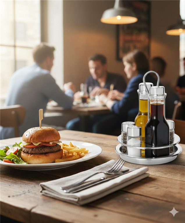The Daisy five-piece set, for oil, vinegar, salt, pepper and toothpicks, represents an exceptional ratio between quality and price, and at the same time ensures the perfect appearance of every table.